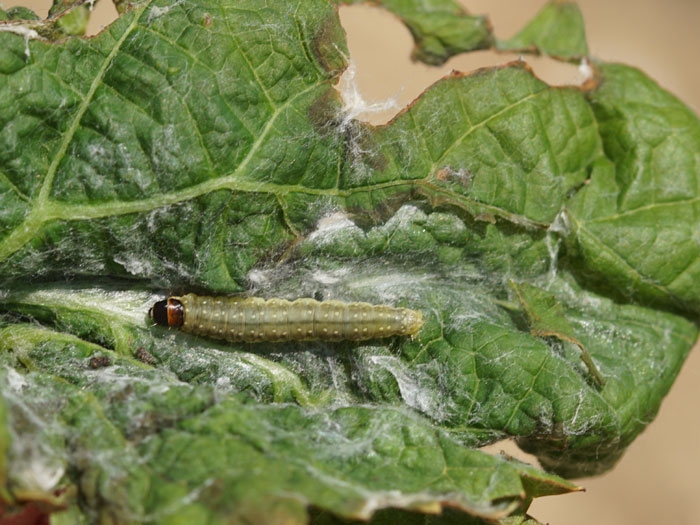 Aproximadamente 3 días antes de la eclosión , podemos ver claramente por transparencia la cápsula cefálica de la joven larva así como sus mandíbulas: esta es la etapa de la cabeza negra. La oruga de la polilla tiene una cabeza marrón, casi negra. Su cuerpo es verde con una raya marrón longitudinal. En una etapa equivalente, la oruga de la polilla es más grande que la de eudemis y cochylis (> 2.5 cm antes de la pupa). A menudo se encuentra enrollado debajo de las hojas donde teje su capullo .