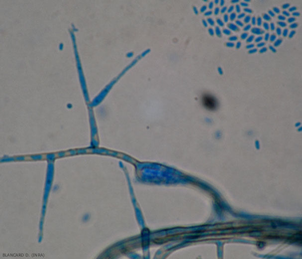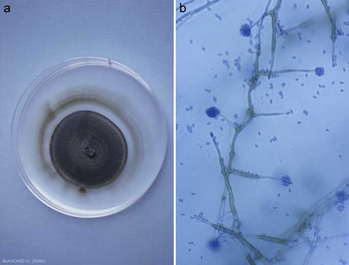 - Los conidióforos son simples y cilíndricos, de color verde parduzco y de paredes gruesas en su base, su color es más claro en su punta. Están coronados por una célula conidiógena (fialida) más ligera, ampuliforme y alargada, rematada por un collar (figuras 1, 2 y 4). Los conidios son subhialinos, oblongo-elipsoide obovados a la derecha, agrupados en glomérulos. Miden 3-4 x 1-1,5 micrómetros (Figura 2). De clamidosporas globulares a subglobulares (Figura 3), oliva a verde oscuro (7-15 micrómetros de largo), aisladas o en cadenas cortas se forman en más o menos dependiendo de las cepas.