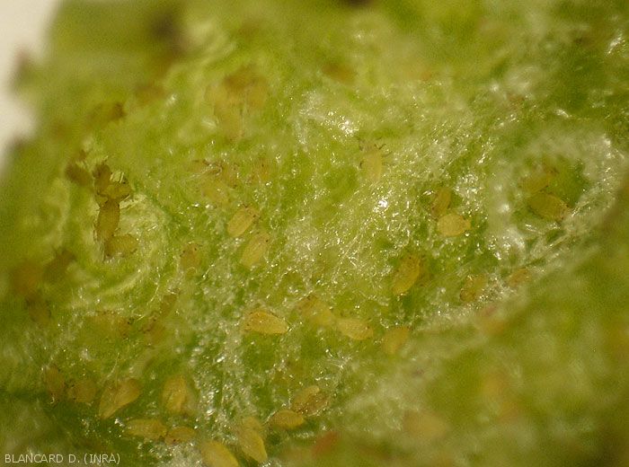 Las larvas (figura 2) tienen forma de pera y de color amarillo verdoso, excepto las larvas que hibernan, que son más oscuras. Su tamaño varía según la etapa de desarrollo; pueden alcanzar 1,2 mm de largo. Las larvas recién nacidas de radicole solo se mueven una distancia corta dependiendo de la concentración de arcilla.