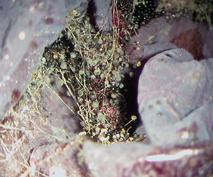 R. stolonifer , que evoluciona rápidamente en las bayas, pronto esporula en forma de numerosos esporangióforos que albergan innumerables esporas negras en vesículas de esporas (figura 1). Estos se propagan por el viento a grandes distancias y por salpicaduras de agua y algunos insectos. Cabe señalar, como en el caso de Botrytis cinerea , que la transmisión de bayas podridas a bayas sanas es muy frecuente en los racimos.