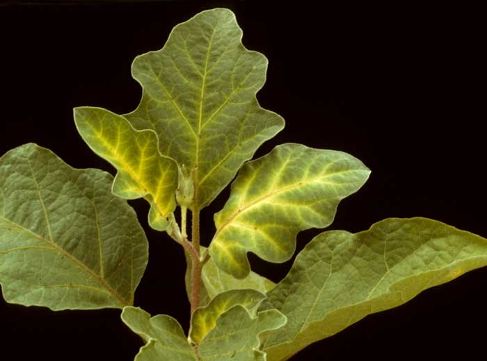 - Marmoleado, amarillamiento de la hoja (en manchas, nervaduras, periferia de la lámina de la hoja, nervaduras entre las nervaduras; decoloración; tinte verdoso a lívido, apariencia opaca y / o bronceada de la lámina de la hoja) (figuras); lesiones, manchas cloróticas más o menos extensas, que rápidamente se vuelven necróticas (figura 9); marchitarse y secarse (cifras);