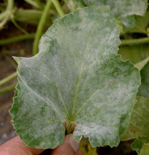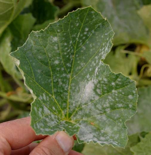 * Cabe señalar que en especies o variedades de Cucurbitáceas poco sensibles al mildiú polvoriento, los síntomas serán atípicos y se materializarán por el desarrollo de manchas amarillentas en lugares donde el hongo tendrá alguna dificultad para establecerse (figuras 6 y 7 ).