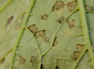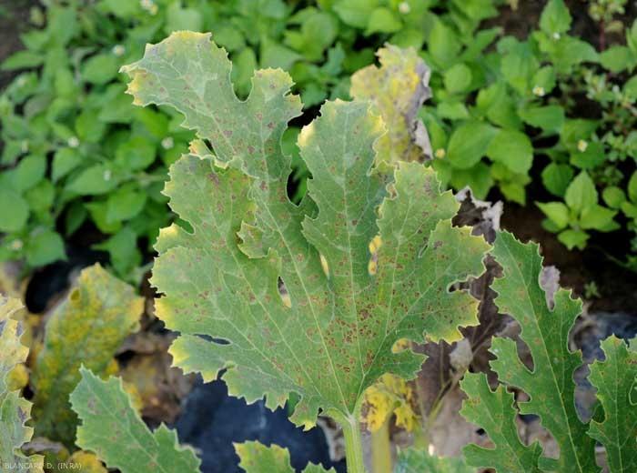 - para otras cucurbitáceas, las manchas son de forma más irregular, más bien redondeadas, como en el melón, por ejemplo. En esta planta, las manchas están húmedas al principio, luego rápidamente se vuelven amarillas y marrones. Finalmente, un borde clorótico los rodea. Estas manchas se inician a veces cerca de las venas que se vuelven marrones en una porción más o menos limitada. Durante períodos de alta humedad, el tejido afectado puede romperse y caerse.