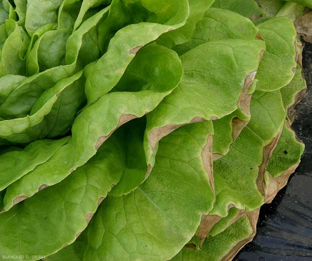 Existen diferencias de sensibilidad entre los tipos de ensalada.  Las variedades con hojas delgadas y muy cortadas son particularmente susceptibles.  <b> Necrosis marginal </b>