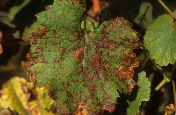 Las manchas foliares causadas por <i> <b> Plasmopara viticola </b> </i> son inicialmente aceitosas a translúcidas y luego se vuelven amarillas rápidamente, como es el caso de esta hoja.