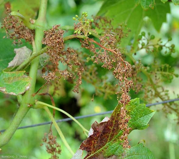 Inflorescencias completamente destruidas por <i> <b> Plasmopara viticola </b> </i>.