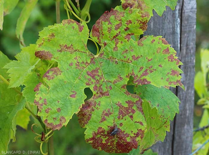Este tipo de síntoma, llamado 'mildiú del mosaico', causado por <b> <i> Plasmopara viticola </i> </b> en una hoja de vid, se encuentra aquí en una etapa avanzada: las manchas dispares se unen y se necrosan.