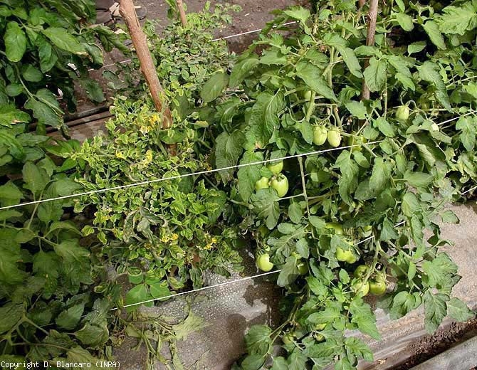 Esta planta, con un puerto bastante tupido, tiene muchas ramas axilares con entrenudos muy cortos y hojas mucho más pequeñas. <b> <i>Tomato yellow leaf curl virus</i>, TYLCV)</b>