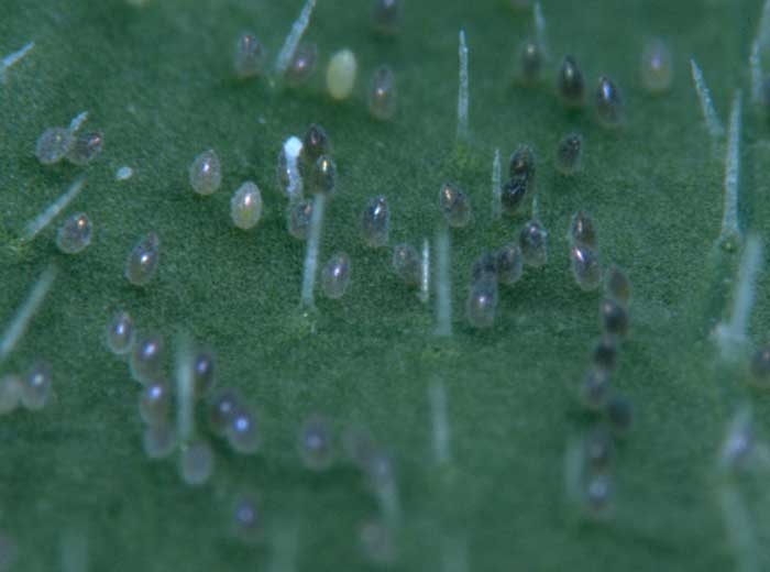 Trialeurodes vaporariorum y Bemisia tabaci tienen 3 etapas de desarrollo que tienen lugar en la parte inferior de los folíolos de calabacín: huevo, 4 etapas larvarias y adultos. La duración del ciclo completo (figura 1) varía según la temperatura. Para T. vaporariorum varía desde menos de 20 días a 27 ° C hasta más de 40 días a 14 ° C (más de 50 días para B. tabaci ).