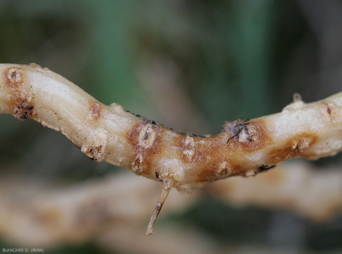 Diminutas estructuras esféricas negras , M. cannoballus perithecia y ascosporas, son visibles en la superficie de las raíces (Figuras 4 y 5) y caracterizan la presencia de este hongo. Estos signos, materializando la forma sexual o teleomórfica de este ascomiceto, no siempre son fáciles de observar porque pueden formarse sobre tejidos radiculares ya bien descompuestos que no serán recuperados durante el desarraigo de los sistemas radiculares. Además, tenga cuidado de sacarlos suavemente con la ayuda de una herramienta de labranza.