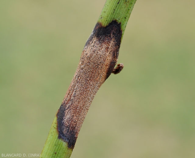 • Las lesiones en pedicelos  y ramitas son más o menos alargadas y deprimidas, de color pardusco; Los tejidos afectados en la periferia son de color marrón oscuro a negruzco (Figuras 10 a 17). Las alteraciones también pueden ser aftas, rodeadas de bandas de tejido cicatricial que hacen que la corteza estalle en tiras bastante características (Figuras 10, 11, 15 y 16). Tenga en cuenta que las alteraciones en los brotes verdes se localizan alrededor de los nudos (figuras 12, 13 y 16).