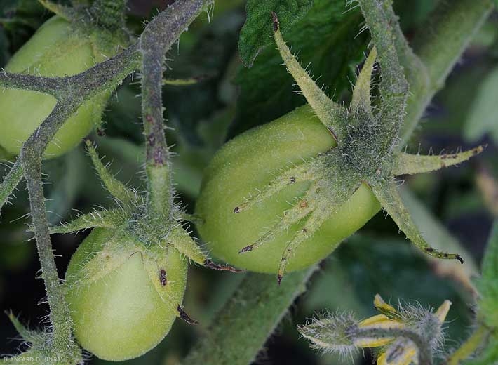 De las lesiones comparables son visibles en los otros órganos, particularmente el pecíolo (Figura 5), ​​el tallo (Figura 6), los los tallos y sépalos frutos de (Figura 7). Con frecuencia son más extensos y alargados que en los folíolos. Cuando está presente en los pedicelos de las flores, pueden caer algunas flores.