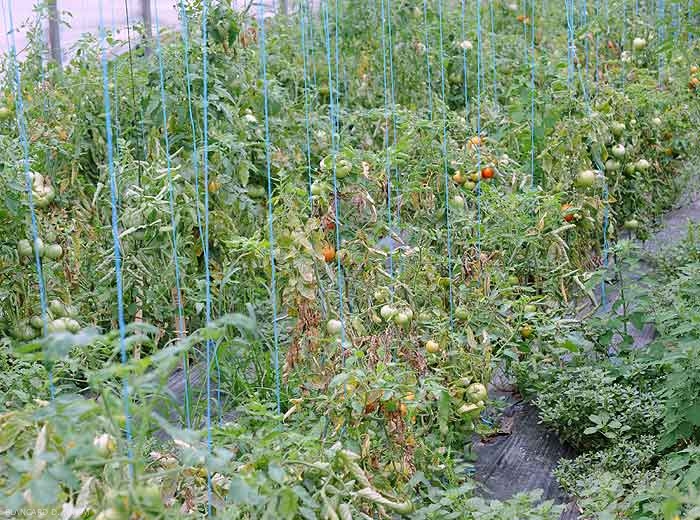 El daño de las raíces limita el desarrollo de las plantas, que se atrofian más o menos. Las hojas inferiores pueden estar cloróticas y marchitarse durante los períodos cálidos del día, pero pueden recuperar su turgencia durante la noche (fotos 9 y 10). En los casos más severos, se puede observar secado y caída de hojas.