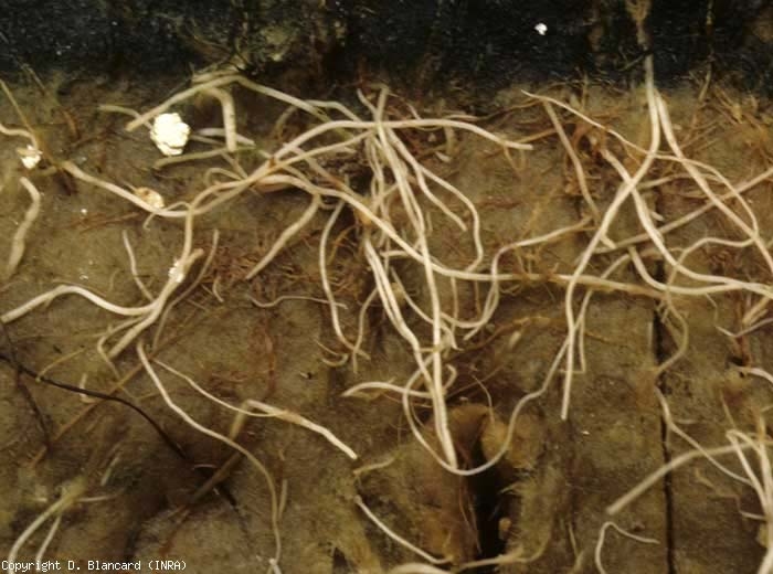 De Pythium spp. se aíslan con frecuencia raíces de de tomate aparentemente sanas o afectadas. Su presencia en un sistema de raíces no se asocia sistemáticamente con daños. De hecho, Pythium spp. revelan poderes patógenos muy diferentes en las raíces del tomate entre especies. Además, la expresión de su poder patógeno a menudo depende de interacciones complejas entre el desarrollo del hospedador (el tomate en este caso), el medio ambiente y Pythium spp. regalo. Es probable que varias especies provoquen un pardeamiento de las raíces ( pudrición de la raíz por Pythium, marchitez ) que a veces se encuentran al final de las raíces. Destacamos especialmente el pardeamiento, la descomposición y la desaparición de raicillas y raíces de pequeño diámetro. La corteza de las raíces principales y la raíz primaria también eventualmente se pudren más o menos localmente. Los tejidos vasculares opuestos a las áreas alteradas eventualmente se vuelven marrones. Estos síntomas a veces aparecen en el suelo (especialmente en los trópicos y subtrópicos húmedos), con mayor frecuencia en los sin suelo (en las zonas de producción templadas y septentrionales) (figura 6).