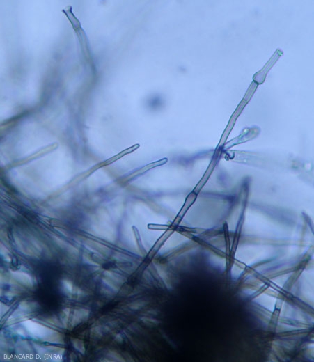 • Su forma imperfecta ( Dematophora necatrix Hartig) está en el origen de la coremia erecta de 1,5 mm de altura, mostrando en su extremo apical conidióforos sobre los que se producen conidios. Los conidios son solitarios, unicelulares, elípticos a ovoides, lisos de 3-4,5 x 2-2,5 µm. Estas coremia parecen de naturaleza rara y, por lo tanto, no juegan ningún papel en la epidemiología de la enfermedad.