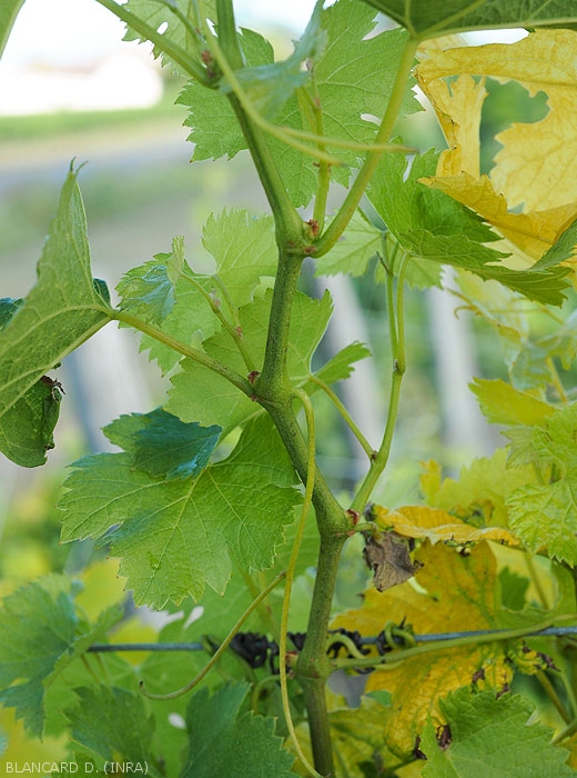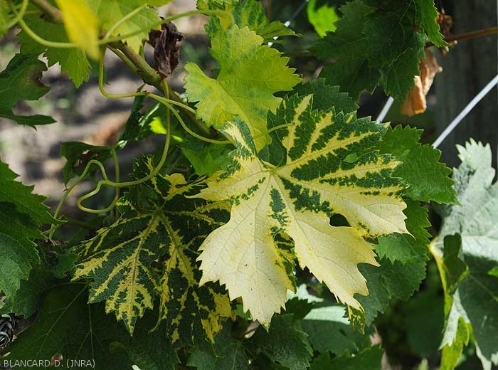 Las hojas que crecen en las enredaderas enfermas muestran diversas anomalías en el color y la forma. Por tanto, podemos observar variegaciones o mosaicos de color amarillo dorado localizados inicialmente a lo largo de las nervaduras y luego generalizándose a todo o parte del limbo foliar. A veces, los anillos o líneas son visibles por la transparencia de las hojas jóvenes. También se observan anomalías en la morfología del limbo: venación aberrante con asimetrías, hojas de corte doble o irregular o con una hendidura más marcada.