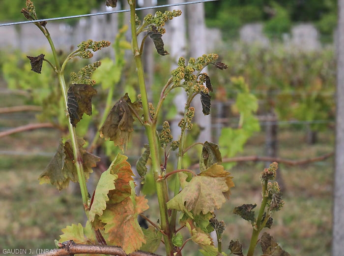 - Las heladas primaverales se producen cuando las vides reanudan su actividad. Los síntomas son variables y dependen del estadio vegetativo. Al brotar, lasyemasyramitas quemiden unos pocos cm se vuelven marrones y se secan (figuras 1 a 12). Si la helada es intensa, puede haber destrucción total de la vegetación que se vuelve marrón después del deshielo y toma la apariencia de una ensalada cocida, antes de secarse (Figuras 3, 4, 7 y 10). Las inflorescencias también se vuelven marrones y secar (Figuras 4 y 5). Si la helada es débil, solo se ven afectadas las hojas altas y el ápice (Figura 1). Recuerda que se conocen 2 tipos de heladas primaverales: