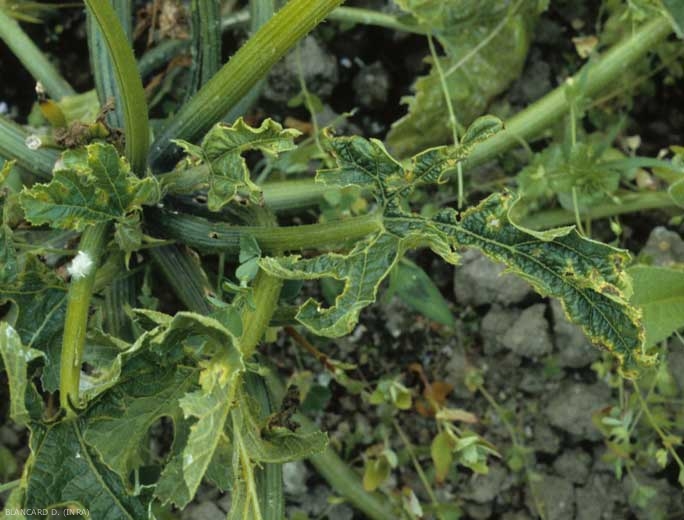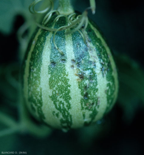 En cuanto a los frutos de calabacín y calabacín , cuando son jóvenes presentan pequeñas manchas grasientas, cancros y marrones (Figuras 9 a 13). Una vez que están bien desarrollados, a veces tienen corchos y están muy deformados (Figuras 14 y 15).