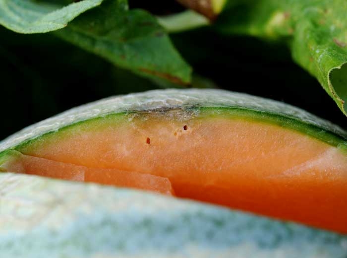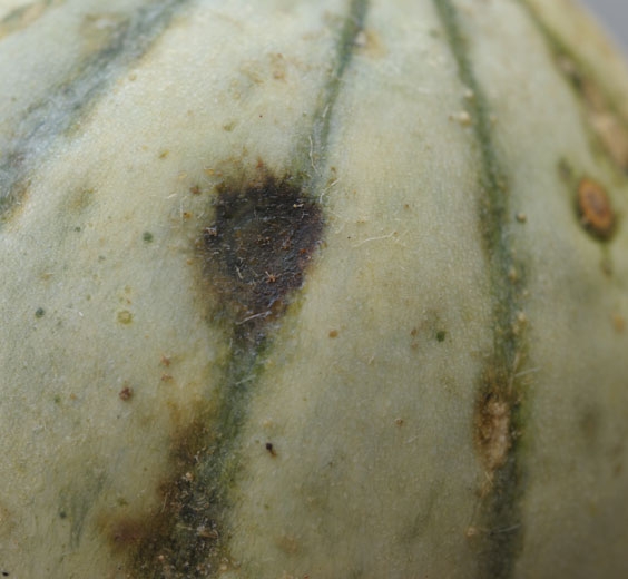 Una multitud de pequeñas lesiones húmedas cubren este melón.  <b> <i> Pseudomonas syringae </i> pv.  <i> aptata </i> </b> (fuego bacteriano)