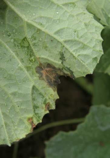 En estas hojas de melón aparecieron muchas manchas de grasa que gradualmente se volvieron necróticas, de forma irregular. <i> <b> Pseudomonas syringae </b> </i>