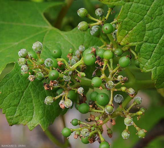 <b> <i> Plasmopara viticola </i> </b>: síntoma de 'eructo gris' en bayas inmaduras.  El agente del mildiú esporuló fuertemente sobre este último una vez colonizado.