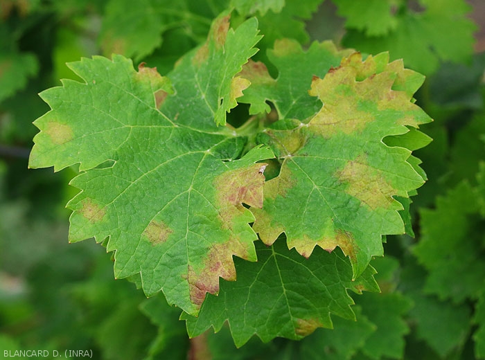 Grandes manchas foliares cloróticas inducidas por <i> <b> Plasmopara viticola </b> </i>.
