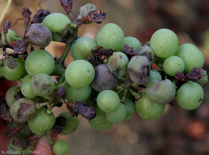 En algunas bayas, se pueden observar manchas de color marrón a negruzco, deprimidas "en empuje".  Algunos de ellos están más o menos marchitos.  <b> <i> Plasmopara viticola </i> </b>