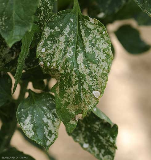Los tejidos cerca de la nervadura central y algunas venas secundarias han adquirido un tinte blanquecino.  <b> Fitotoxicidad </b>