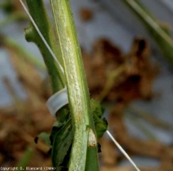 En este tallo son visibles pequeñas lesiones de cancro beige.  <b> <i> Clavibacter michiganensis </i> subsp.  <i> michiganensis </i> </b> (cancro bacteriano)