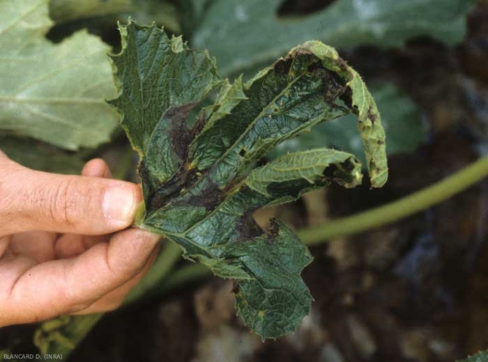 - Lésions humides sur les organes au contacts du sol ou ayant subi des projection de terre (feuilles, rameaux, fruits chez les Cucurbitacées.