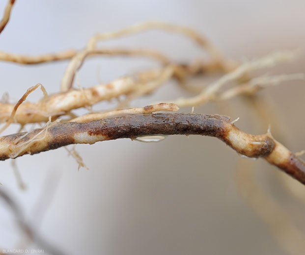 - Altérations racinaires brunes et lisses devenant superficiellement liégeuses sur le cortex ; celles-ci ceinturent progressivement les racines qui présentent à terme des manchons plus ou moins renflés, craquelés et d'apparence sèche ;