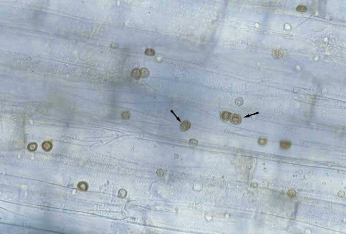 D'autres champignons proches, les Chytridiales (figures 1 à 3), accompagnent parfois les "pertes racinaires" observées sur semis flottants de tabacs. On les retrouve seuls ou en mélange avec Olpidium brassicae sur et dans les tissus racinaires. Leur identification n'est pas facile. Les structures observées dans les cellules de tabac ou à proximité ne sont pas sans rappeler celles qui matérialisent la présence de Rhizophydium spp. ou d'autres champignons aquatiques. Quelques-uns d'entre eux ont déjà été observés dans les racines de plusieurs Nicotianées, en particulier sur tabac : Lagena radicicola Vanterpool & Lindergham et Rhizophydium graminis Ledingham.