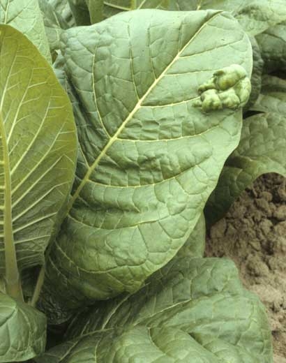 Ces trois anomalies génétiques, que l'on rencontre exceptionnellement sur le terrain, provoquent des symptômes plus ou moins généralisés à l'ensemble des feuilles d'une ou de plusieurs plantes. Il en existe d'autres, dont les symptômes peuvent être beaucoup plus localisés. On peut s'en rendre compte sur le pied de tabac présenté sur la figure 6 ; on y observe sur une de ces feuilles une énorme et irrégulière cloque dont l'origine est aussi génétique.