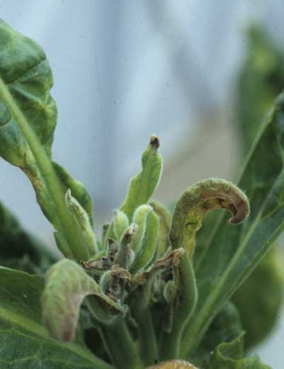 - la carence en bore dont une insuffisance chez le tabac en cet oligoélément induit un ralentissement du processus de division cellulaire, en particulier au niveau des sites de croissance des plantes. Par conséquent, celles-ci ont un développement réduit. De plus, les feuilles du bourgeon apical prennent une teinte jaune pâle et cessent de croître (figure 3). Certaines vieilles feuilles sont anormalement "découpées" (figure 4).