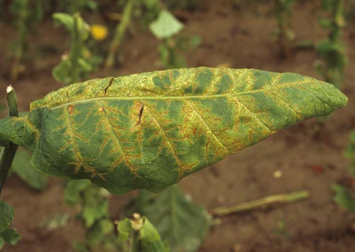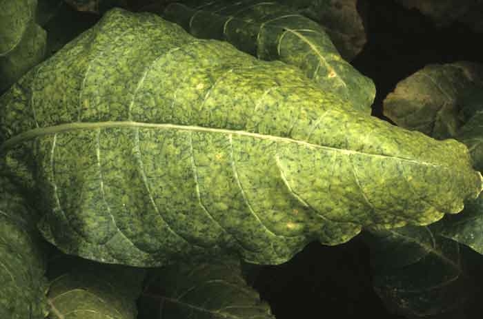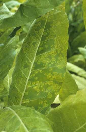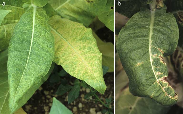 Les feuilles affectées sont parfois de taille réduite, crispées et enroulées. Si les infections sont précoces, la croissance des plantes peut être fortement réduite (figure 13). La nature et l'intensité de ces symptômes peuvent varier en fonction du type de tabac cultivé, de la variété, mais surtout en fonction de la nature de la souche en cause.