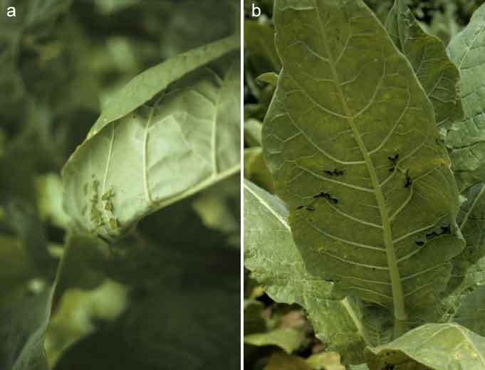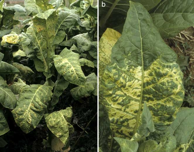 L'apparition sur les feuilles de symptômes de couleur jaune vif caractérise la présence du virus de la mosaïque de la luzerne (Alfalfa mosaic virus, AMV) dans le tabac. Les nervures et les tissus contigus, de larges plages de tissus, des anneaux amples, des arabesques, prennent cette coloration dans un premier temps (figures 1 à 3). Par la suite, les tissus affectés peuvent se nécroser.