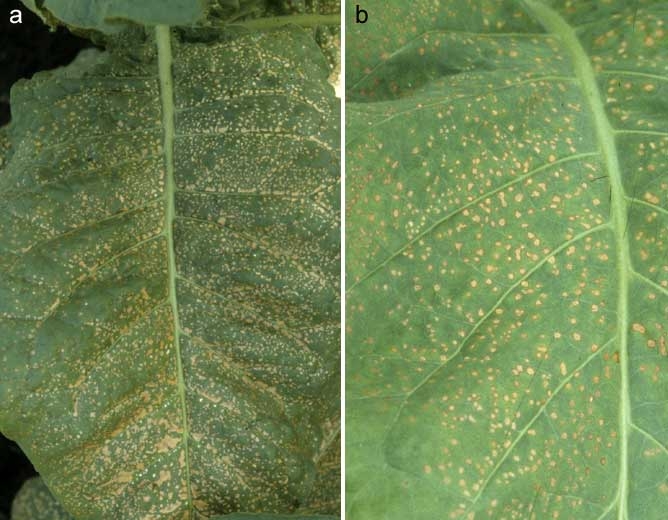 De nombreuses bandes de tissus vert sombre sont disposées le long des nervures (vein banding) (figure 2), on note aussi la présence de petites taches blanchâtres à brunes sur la face supérieure des feuilles hautes, assez similaires aux taches de "weather fleck" (figure 3).