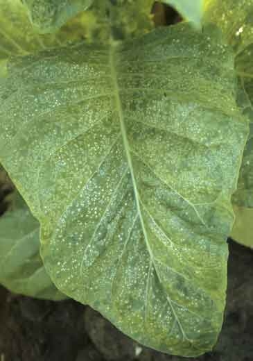 Plusieurs virus sont susceptibles de provoquer des petites lésions nécrotiques sur les feuilles de tabac. Le Virus Y de la pomme de terre (Potato virus Y, PVY) est certainement celui qui, en France, occasionne le plus fréquemment ce type de symptôme. Soulignons que la nature des taches varie en fonction des génotypes de tabac. Elles peuvent être notamment brunes, entourées d'un halo jaune, rappelant une bactériose (figure 1).