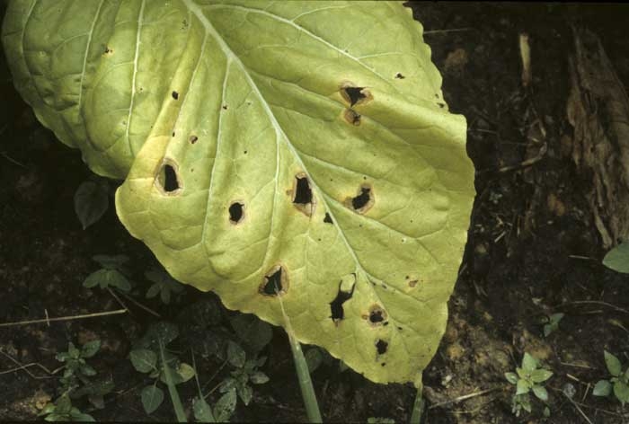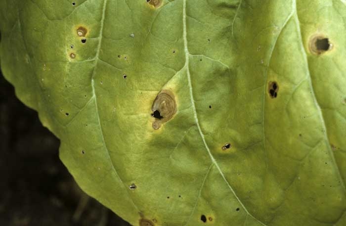 Thanatephorus cucumeris (anam. Rhizoctonia solani) est responsable de nombreuses taches sur les feuilles basses des tabacs. Celles-ci se caractérisent à terme par une coloration brun clair et la présence de motifs concentriques (figures 1 à 4). Cette dernière caractéristique est à l'origine de l'appellation anglo-saxone de la maladie, "target spot". Lorsque les conditions sont très humides, on observe parfois sur les feuilles le développement d'un feutrage poudreux (hyménium) (figure 5) produisant des basidiospores à l'origine de contaminations aériennes secondaires. C'est une maladie fongique relativement récente ; elle a été signalée aux USA, au Canada, en Afrique du Sud, au Zimbabwe, au Brésil et au Costa Rica mais pas en France.