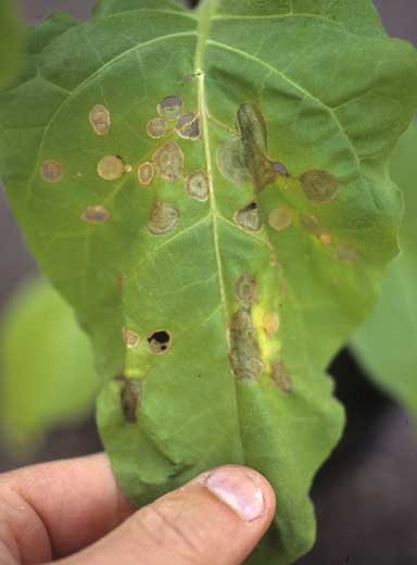 Thanatephorus cucumeris est un champignon responsable d'une multitude de symptômes sur tabac. C'est un redoutable agent de fontes de semis en pépinière (figures 1 et 2). Il est à l'origine d'absence de germination et d'altérations humides situées au niveau du sol sur la tige des plants. Par la suite, celles-ci brunissent et ceinturent progressivement le collet. Simultanément ou ultérieurement, les plantules flétrissent et meurent très rapidement, donnant l'impression d'avoir "fondu".
