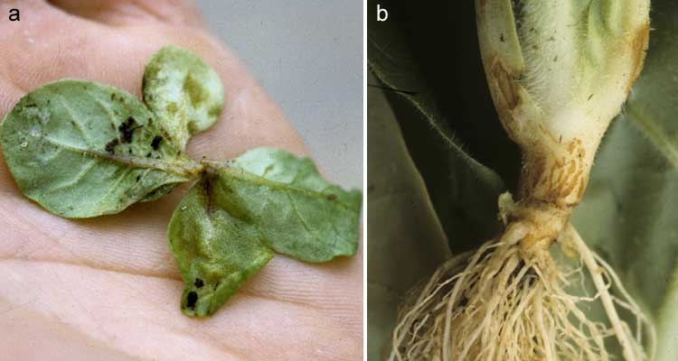 Dans certaines conditions (sols fortement contaminés, climatologie particulière...), le système racinaire de plantes adultes est plus ou moins colonisé extérieurement par la forme asexuée Rhizoctonia solani. On distingue facilement un réseau mycélien brun en surface. Les racines ainsi envahies sont jaunâtres à marron, superficiellement liégeuses, et de nombreuses radicelles nécrosées ont disparu (figure 5).