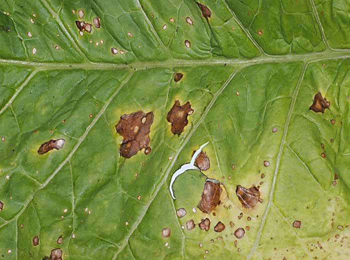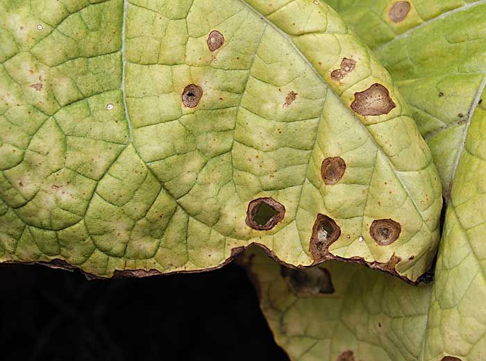 La forme parfaite ou téléomorphe du champignon, Thanatephorus cucumeris, produit des taches foliaires aussi bien sur les jeunes plants en pépinière, que sur les plantes adultes au champ (figures 6 à 8). Les taches sont souvent humides et circulaires en début d'évolution. Par la suite, en fonction des conditions climatiques, elles présentent des motifs concentriques plus ou moins larges et un halo chlorotique d'intensité variable. Au centre des taches, les tissus plus fragiles tombent ; les feuilles se retrouvent ainsi trouées. Durant les périodes humides, un hyménium se forme à la périphérie des taches ; c'est sur ce dernier que se forment les basides et les basidiospores.
