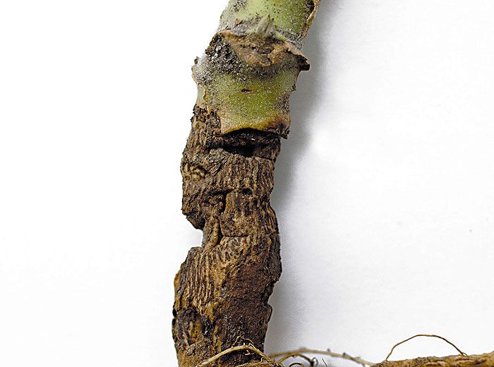 Si les contaminations ou les dégâts ne sont pas détectés en pépinière et que les plantules malades sont plantées, un chancre brun rougeâtre (figures 3 et 4) se met en place en même temps que les plantes se développent plus ou moins bien au champ. Lorsque le chancre devient important, la plante affectée flétrit, jaunit brusquement et se dessèche.