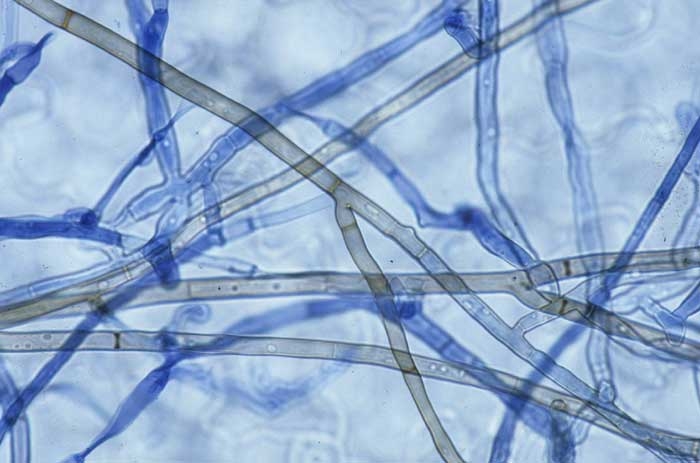 A partir des tissus lésés, le champignon forme du mycélium qui va cheminer sur les tissus et sur le sol et gagner d'autres plantes saines. Il engendre aussi des basidiospores (figure 4) sur l'hyménium formé sur le sol ou les feuilles. Elles sont disséminées par le vent et les courants d'air, sur des distances assez importantes. Des plants contaminés, des outils pollués par de la terre... assurent également sa dissémination.