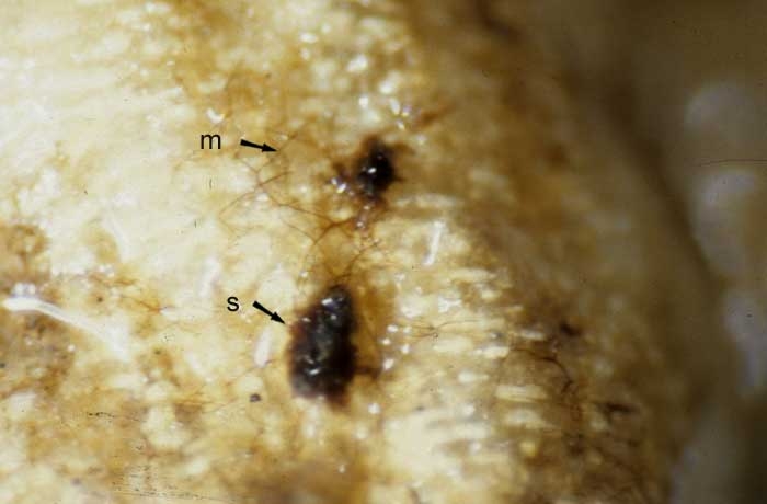 La contamination peut se faire aussi grâce à des basidiospores. Celles-ci proviennent généralement d'un hyménium (figure 3) qui a pu se former à la surface du sol, sur des tabacs déjà malades ou sur d'autres hôtes infectés. Une fois sur les feuilles, ces basidiospores germent et pénètrent les tissus directement à travers la cuticule ou plus rarement par les stomates. Il envahit promptement les tissus et produit de temps en temps un hyménium à la périphérie des altérations.