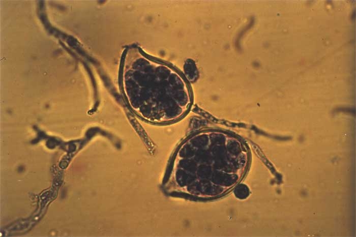 Les zoospores constituent habituellement l'inoculum primaire. Elles sont attirées par les racines, s'enkystent, germent et pénètrent les tissus racinaires. Les contaminations aériennes s'effectuent également par leur intermédiaire, lors de projections d'eau. Un fois en place, le champignon envahit promptement l'épiderme et le cortex. Dans les tissus lésés, mais aussi à la surface des racines, des sporanges et des chlamydospores se forment assez rapidement. Elles sont à l'origine de la conservation de la maladie et d'autres contaminations.