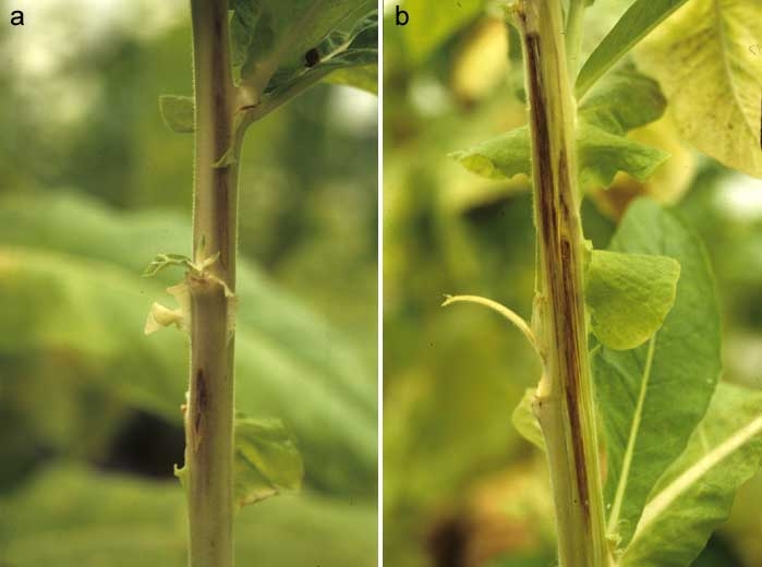 Des infections systémiques se produisent assez fréquemment (figures 6 à 8). Elles occasionnent des déformations foliaires, des brunissements des nervures et des vaisseaux. Les plantes touchées ont leur croissance ralentie, parfois même bloquée.