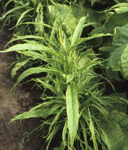 Confrontés à la Polyphyllie (ou "frenching"), les producteurs de tabac observent, aussi bien en pépinière qu'en plein champ, des symptômes assez particuliers affectant essentiellement les feuilles. En premier lieu, ils constatent généralement un jaunissement assez marqué des tissus internervaires. Les nervures au contraire restent bien vertes et contrastent avec le restant du limbe. Par la suite, la croissance des nouvelles feuilles est particulièrement affectée, et donc leur forme. Ces feuilles ne présentent aucun développement radial ; à terme, elles sont très effilées (figure 1), avec la pointe enroulée vers le bas et les bords ondulés (figure 2). Les nombreux bourgeons axillaires se développant sont à l'origine d'une rosette de nombreuses feuilles, petites, étroites et vert pâle (d'où le nom de polyphyllie) et confèrent à la plante un aspect assez caractéristique en balai de sorcière (figure 3).