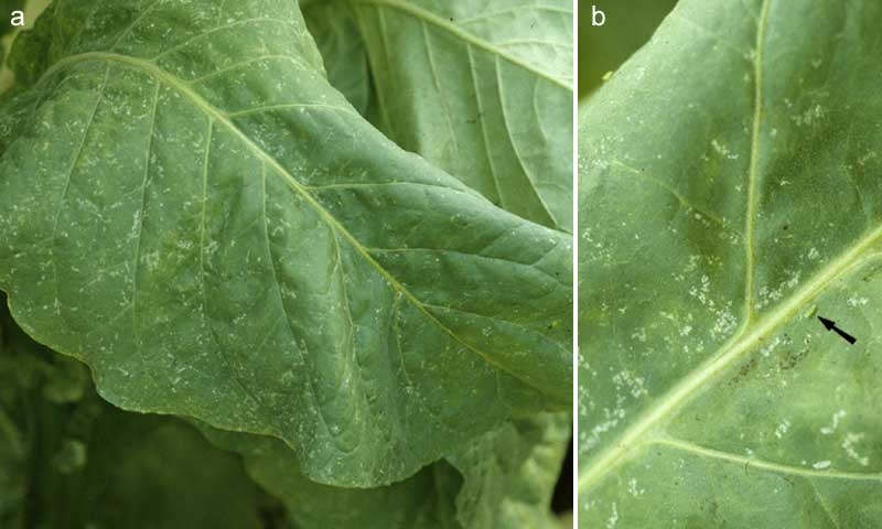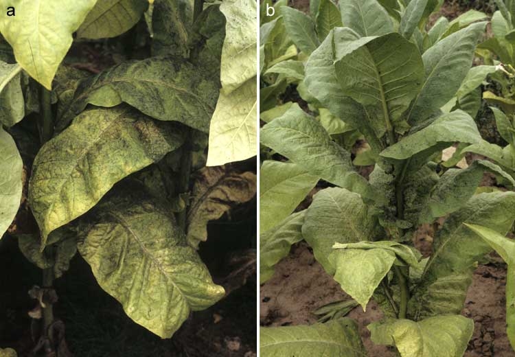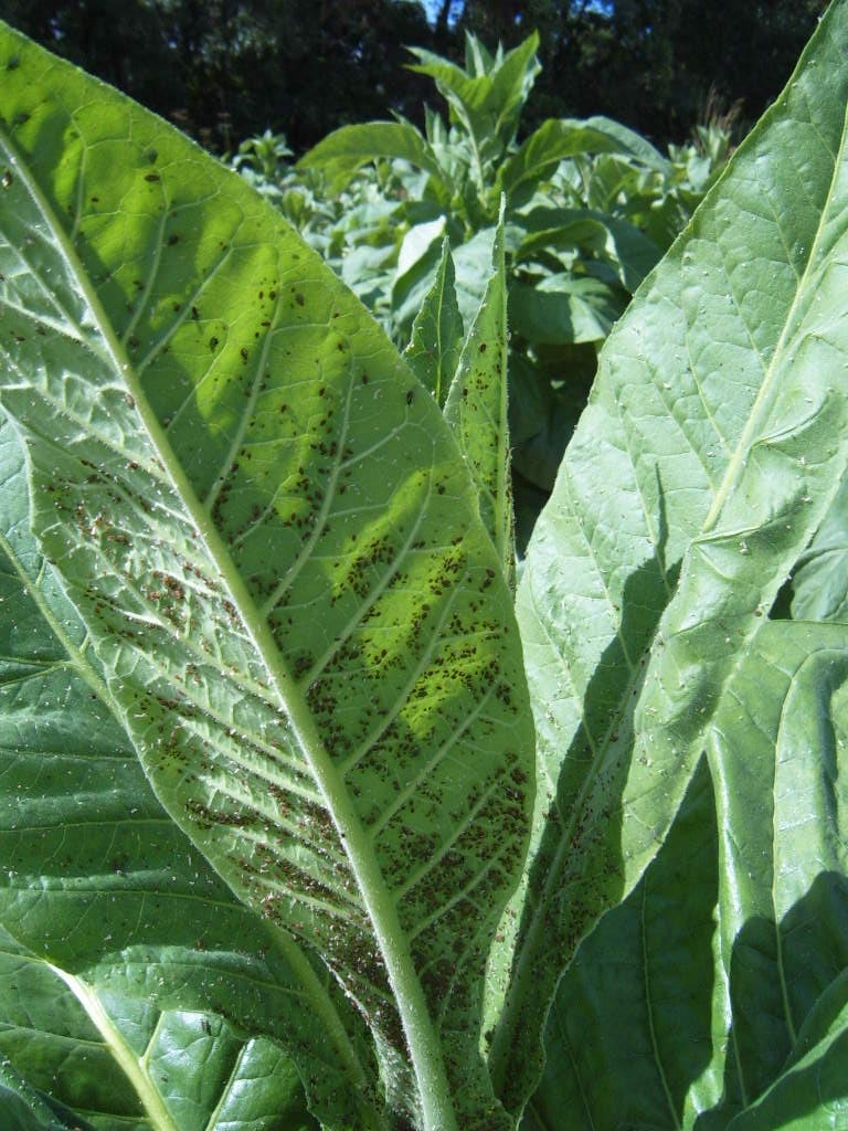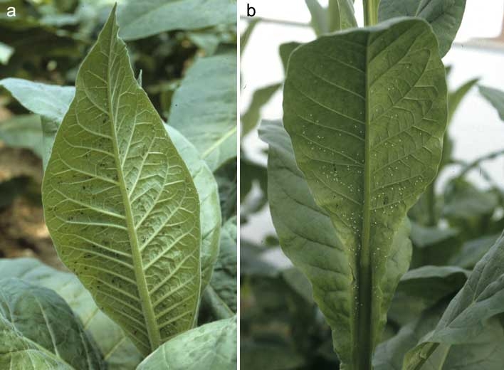 Les pucerons et les aleurodes, en plus d'excréter le miellat à l'origine de la fumagine, perturbent le fonctionnement et la croissance des tabacs. Dans les cas de pullulation de ces insectes, il n'est pas rare de constater des ralentissements, voire des arrêts de la croissance des plantes. Les feuilles peuvent être de taille réduite et partiellement ou totalement déformées. Ces insectes sont aussi de redoutables vecteurs de plusieurs graves virus pour le tabac (consultez les fiches concernant ces bioagresseurs dans la rubrique sur Les virus du tabac).