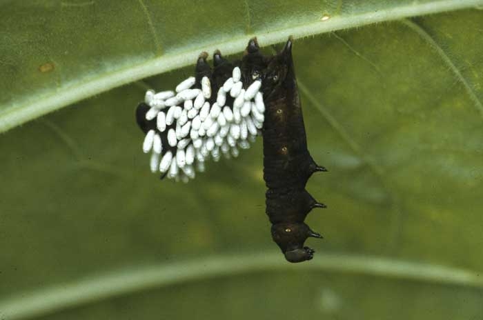 De nombreux insectes auxiliaires naturels ("beneficial insects") fréquentent les cultures de tabac et contribuent à réduire les populations de ravageurs. Certains présentent une réelle spécificité, d'autres sont beaucoup plus polyphages. En France, l'inventaire précis est en cours de réalisation afin de mieux les connaître et de permettre de valoriser leurs potentialités de parasitisme ou de prédation. Comme nous l'avons précisé précédemment, la liste exhaustive des auxiliaires présents dans les cultures de tabac n'est pas connue avec précision. Pourtant, il est assez aisé, lors de visite de parcelles, de constater la présence des plus fréquents et des plus visibles d'entre eux. On peut citer par exemple plusieurs espèces de coccinelles (figure 1), de cécidomyies (figure 2), d'hyménoptères parasitoïdes (figure 3), de syrphes (figure 4), de chrysopes... Certains de ces insectes sont capables de s'attaquer à d'autres ravageurs comme les aleurodes, les thrips, les cicadelles... L'efficacité de ces auxiliaires est encore mal connue. A titre d'exemple, sur la figure 5 on peut observer une chenille défoliatrice parasitée par Apanteles congregatus. La chenille parasitée a été envahie par plusieurs larves qui ont, à un moment donné, filé leurs cocons blancs et ovales, bien visibles à l'extérieur de cette dernière. Aux USA, il n'est pas rare de trouver plus de 90 % de ces chenilles parasitées en fin de saison.